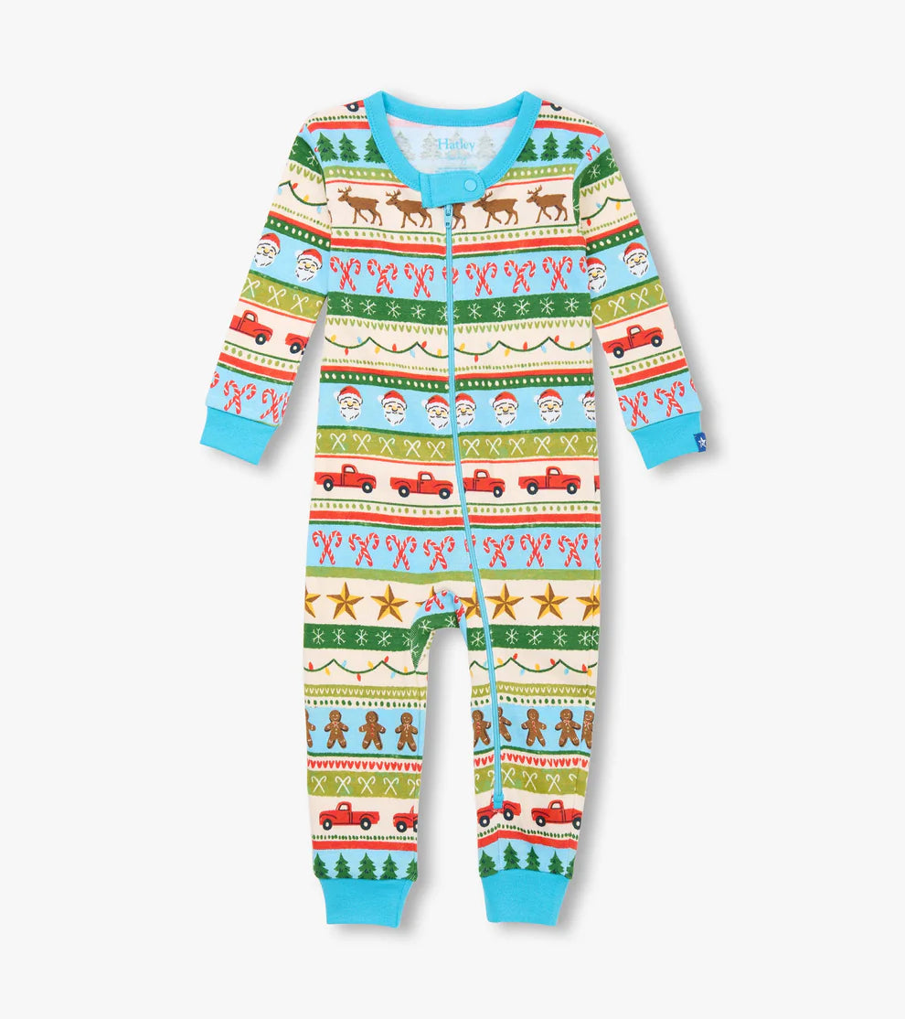 Celebrate the season in style with the Baby Boys Blue Fun Fair Isle Cotton Sleeper, crafted from 100% cotton for cozy, breathable comfort. This footless, snug-fitting sleeper features a festive array of Christmas trees, reindeer, candy canes, Santa faces, gingerbread men, and classic red trucks, arranged in cheerful stripes of red, green, blue, and gold. Designed with a round neckline, long sleeves, and blue cuffs at the wrists and ankles, it’s finished with a front zipper that runs from neck to leg for easy, stress-free changes. The interior zipper guard and top snap closure ensure extra safety and comfort, making this sleeper as functional as it is merry.