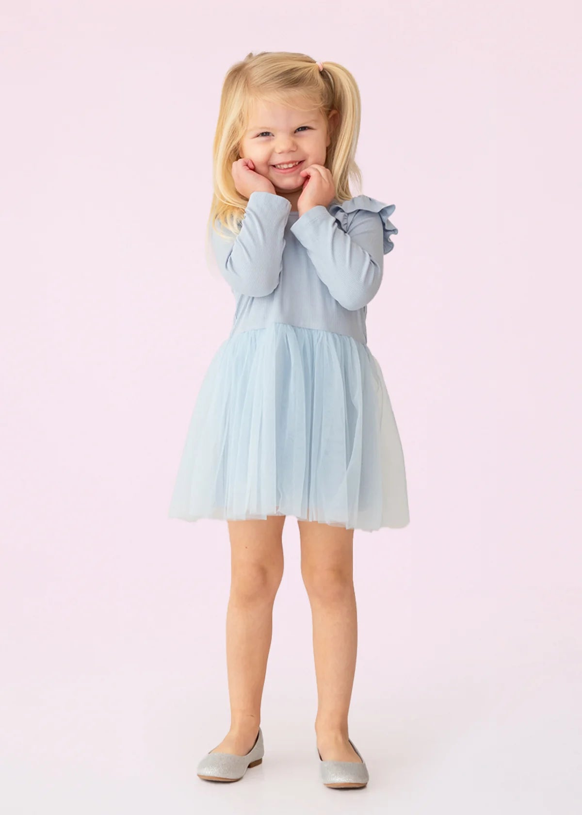 The Tutu in the Clouds Dress is a delicate blend of elegance and whimsy. Its long-sleeved ribbed bodice offers a soft, flattering fit, while the ruffled shoulders add a playful touch. The flowing light blue tulle skirt creates a dreamy, airy silhouette, perfect for twirls and adventures. Designed with comfort and style in mind, this dress is pure magic for delightful days ahead.