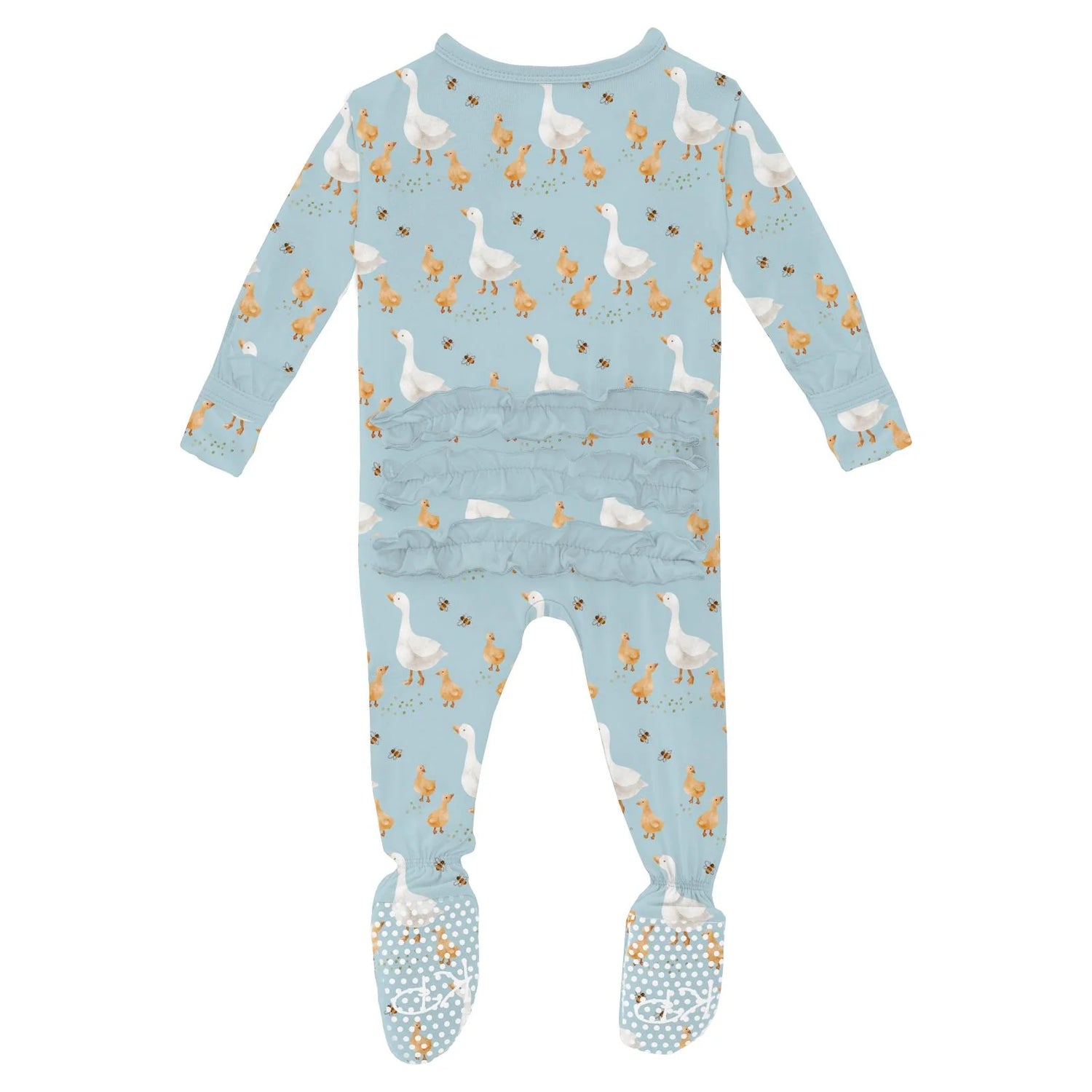 KicKee Spring Sky Feeding Ducks | Print Layette Ruffle Footie With 2 Way Zipper