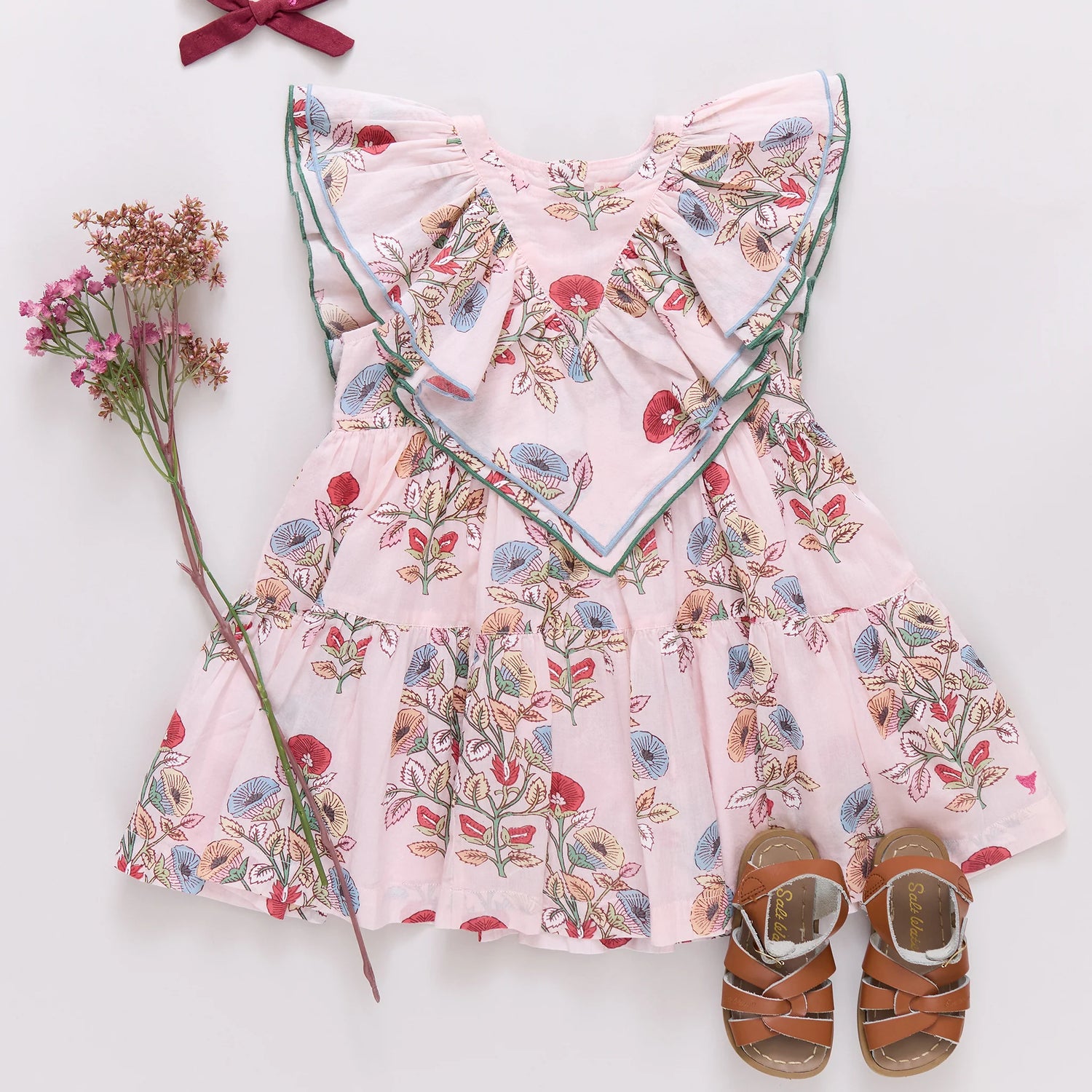 Botanical beauty! Bursting with painterly blooms in soft rose and seafoam tones, our Girls Raphaela Dress captures the romance of a seaside garden. Tiered ruffles cascade gently from shoulder to hem, accented by blue and green pearl stitching and delicate silver buttons. A style made for palm-shaded evenings and flower-filled days. Match with baby in the Raphaela Dress Set for the sweetest floral pairing.
