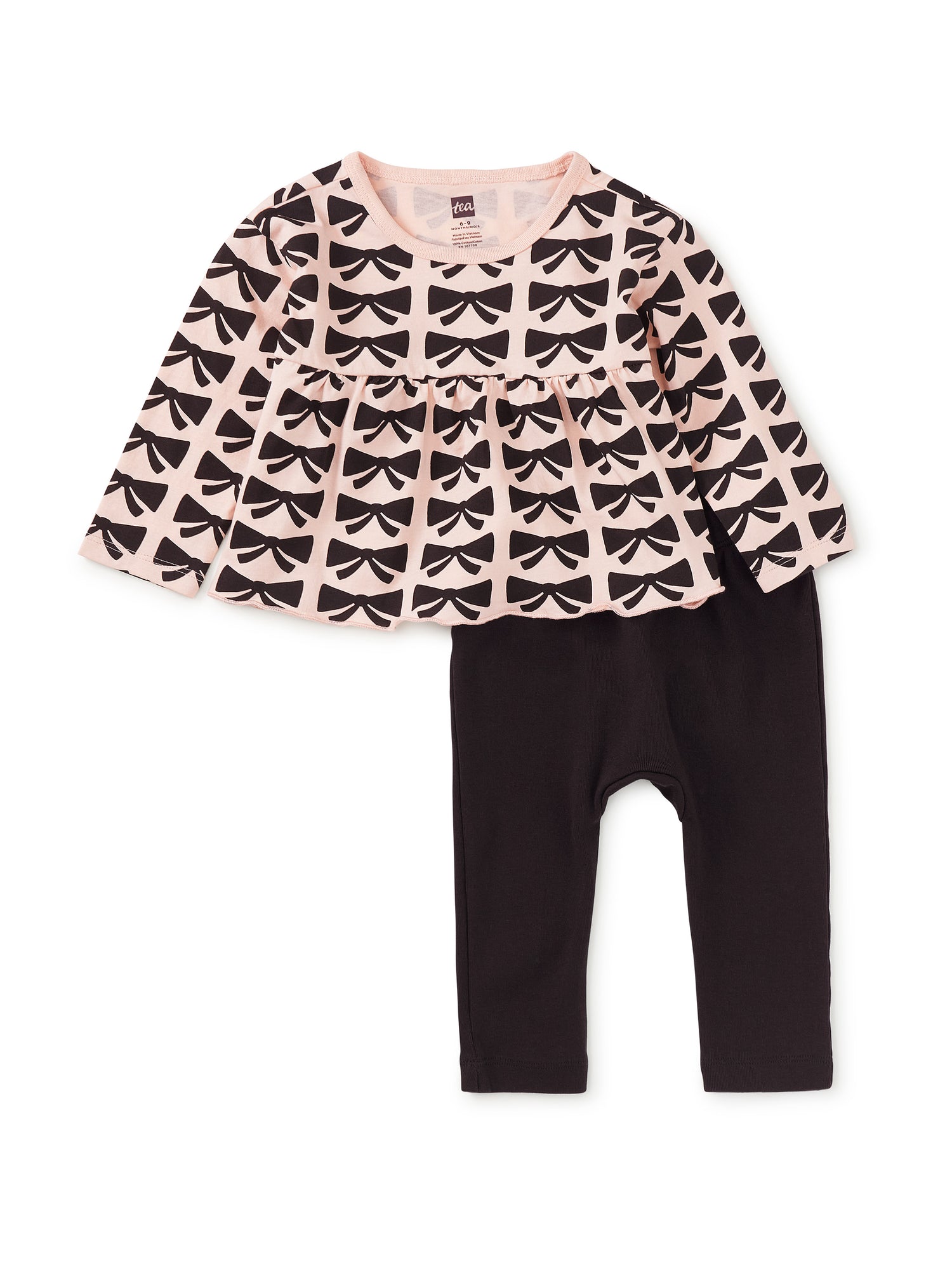 A bow-tiful look for baby. This two-piece set features a swingy peplum top with an allover bow print and soft cotton leggings to match. Easy to wear, comfy to play in, and picture-perfect for every day.
