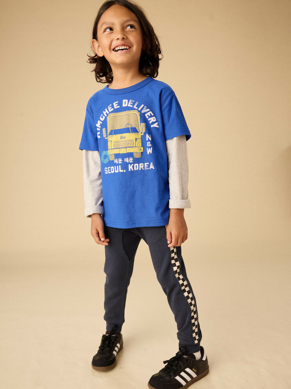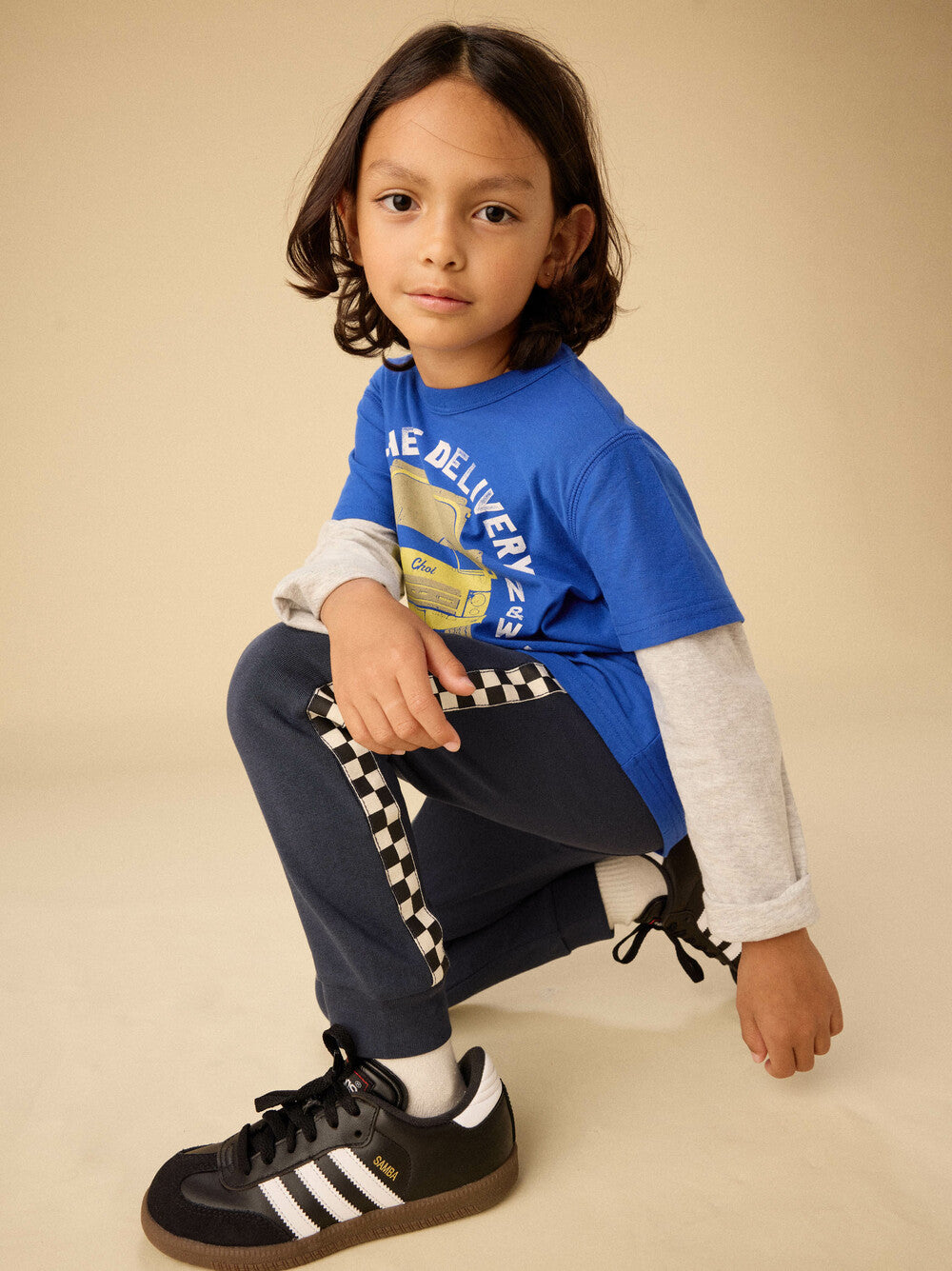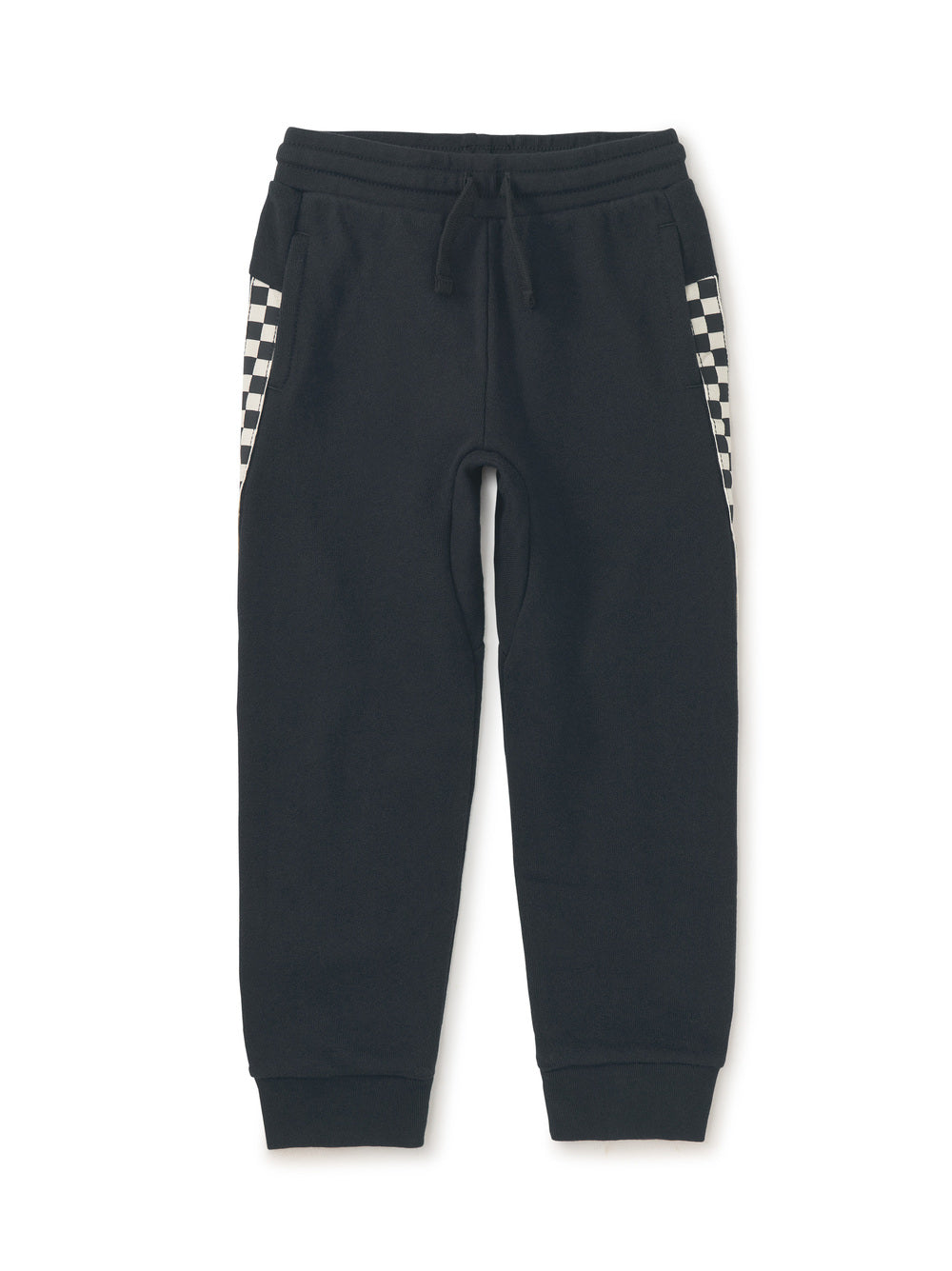 "If cool, comfy, and kid-approved had a uniform, this would be it. The Stripe-Out Joggers are built for cartwheel champs, scooter pros, and anyone who believes playtime is a full-time gig. With sporty checkerboard side stripes, a just-right fit, and 100% cotton French terry softness, they move like your kid does--fast and full of fun.