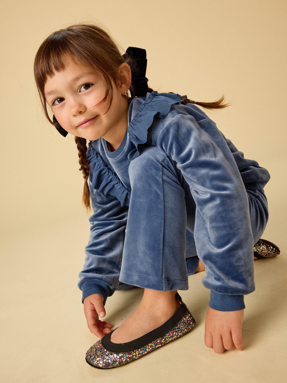 This velour ruffle tunic adds instant polish with its soft shine and charming V-shaped ruffle detail. Designed with an easy fit, drop shoulders, and extra-long sleeves, it's a cozy yet elevated choice for school days, holidays, and everything in between. Pair it with our velour flare pants for a head-to-toe look that feels both comfy and dressy.